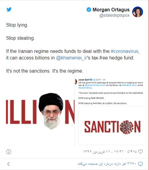 سخنگوی وزارت خارجه ایالات متحده در واکنشی به مقامات جمهوری اسلامی گفت که «دروغ» و «دزدی» را متوقف کنند و اگر نیاز به بودجه برای مقابله با کرونا دارند، از پول هنگفتی که در اختیار علی خامنه‌ای رهبر جمهوری اسلامی است،‌ استفاده کنند.